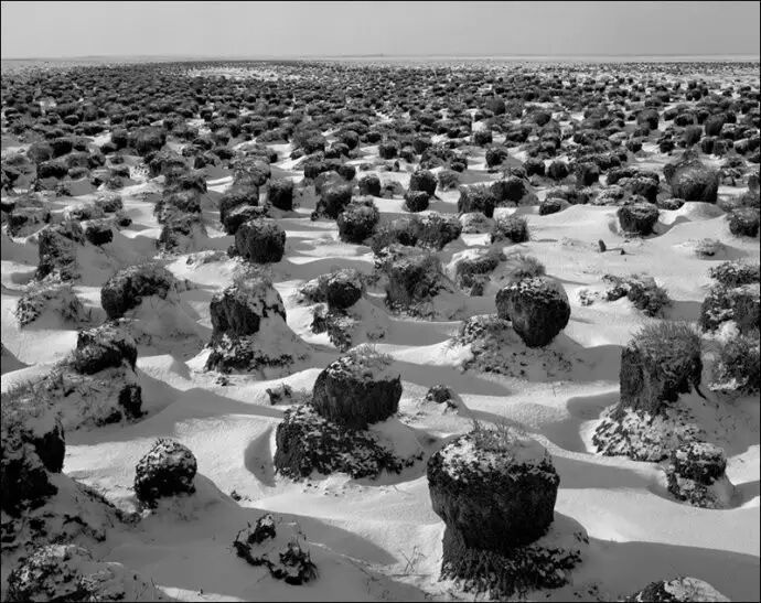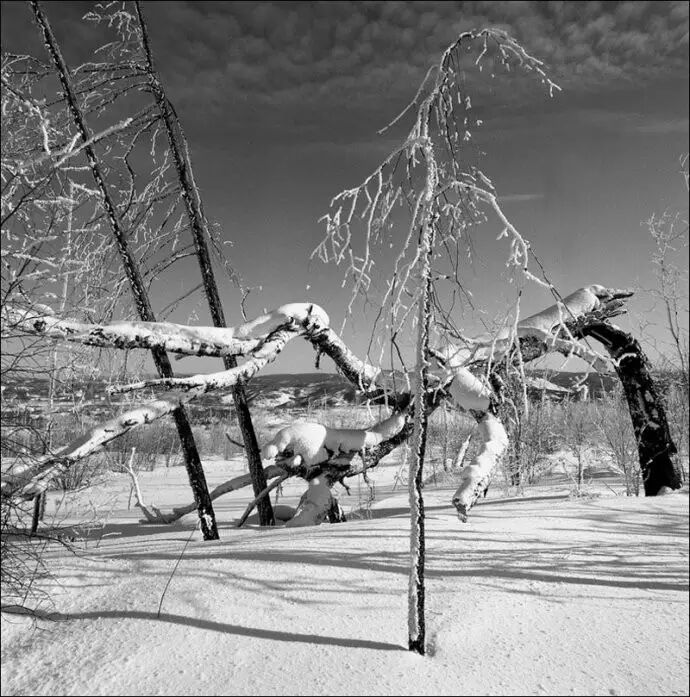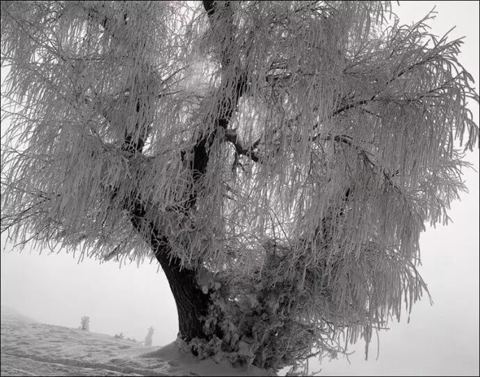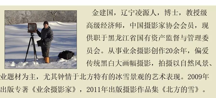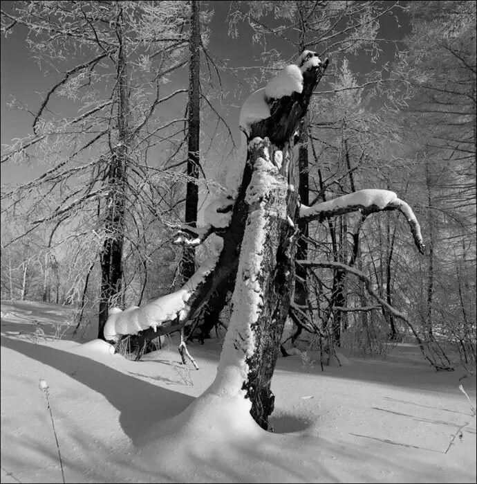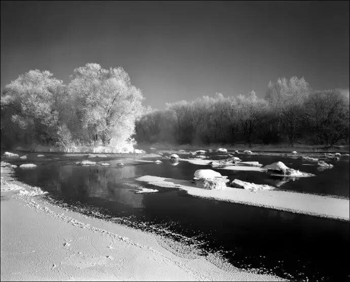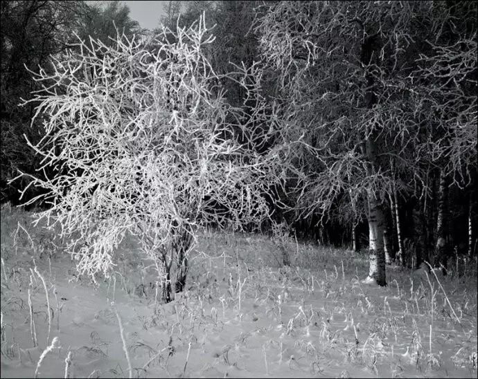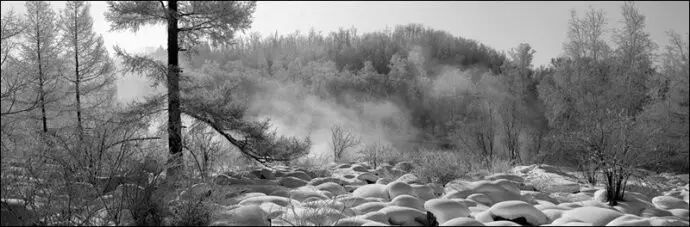 我目前主要用大中画幅相机,黑白胶片拍摄雪景。使用大画幅相机主要是追求影像的高品质,中画幅则是兼顾了画质和轻便灵活。尤其是在深度积雪的野外山地拍摄,即便穿上踏雪板,行走起来也非常艰难,在有限的拍摄时间里负重太大走不了几个机位。因此我每到一个景点,常常先是携带6×6或617片幅相机拍上一圈,同时为大画幅相机拍摄选景,最后再背起沉重的4×5或8×10大画幅相机将选定的的景观一一收入囊中。