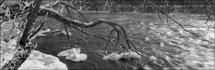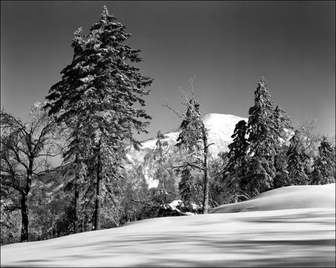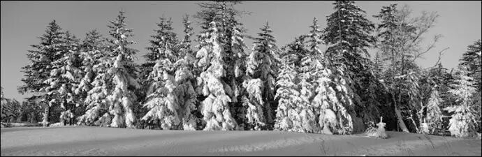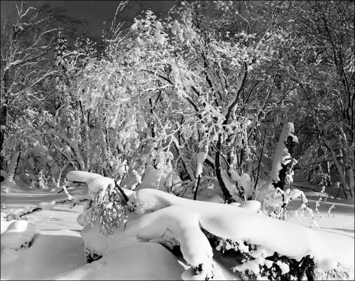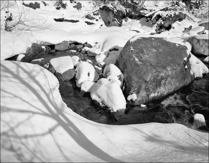 拍雪景在准确曝光上有一点技术难度,因为无论是相机里的测光,还是使用专用的测光表,它都是告诉你一组让你得到一个反射率为18%的灰色调(中灰)的曝光数据,而主要面积是白色的雪景实际色调却高于中灰,如阳光下的白雪实际反射率可能高达90%以上。用亚当斯的分区理论,反射率为18%的中灰调应在五区,而阳光下的白雪应该在七至十区。因此依据测光表不加修正的曝光一般是曝光不足的。我常用的方法是用反射式测光表测阳光下有丰富质感部分的积雪(注意这不是最亮的雪),得出的值再加两档曝光量,也就是将其影调安排在七区。由于雪景中主要面积、重点区域都是白色调的,而暗部,如处于阴影中的树的根部表现可能并不重要,因此通常按我如上的方法测光曝光,按常规方式显影就能得到理想的底片。但如果拍摄主体就是一个有雪覆盖的大树根,景物中低影调部分比重大且细节重要,那么还是严格依照亚当斯的“依暗部曝光,按高光显影”的标准曝光、显影程序来进行好了。
