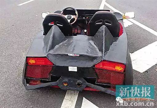 据韩警官介绍,这辆车车头贴了个“保时捷”的车标,车身坑坑洼洼,“做工”十分粗糙,无疑是辆非法改装车辆。这辆车除了仪表盘,车辆的方向盘、油门、刹车、车头大灯、尾灯一应俱全外,还设置了前进和后退两个挡位。当交警询问车辆发动机位置时,司机给出了惊人回答:这车竟是用200CC摩托车发动机车头改装而成。韩警官告诉记者,自己从警34年,处理过各种奇葩的交通违法行为,可像这样将摩托车改装成名牌跑车的还是头一次见。据司机交代,他是附近汽车维修厂的员工,本人并没有机动车驾驶证,这辆车是他们帮附近一间农庄拼装的车辆,当时正准备把车送给客户,刚从灯笼路口出来沿着珠海大道走了几百米,就被交警截获。目前,金湾交警大队已依法扣留这辆拼装的“跑车”,对非法拼装车行及违法驾驶员正在做进一步调查。根据相关法律规定,驾驶拼装汽车上道路行驶将面临罚款4500元、扣6分的处罚。