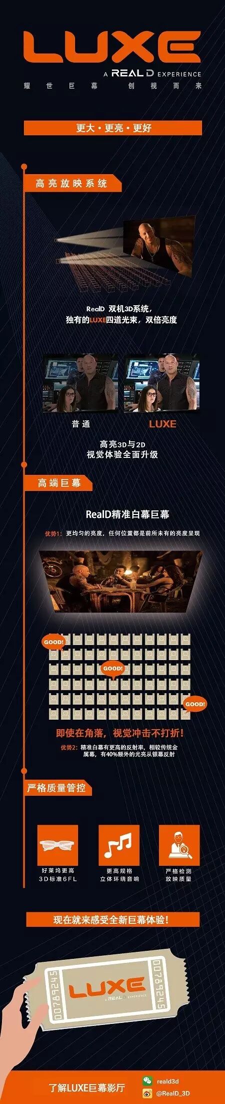 LUXE是由RealD领先技术驱动的全新巨幕品牌,按照行业高标准打造的巨幕影厅。 RealD精准白幕(Precision White Screen)带来更均匀的亮度呈现,观众坐在观众席任何位置都可以享受到高亮清晰的画面,不必再费心选黄金座。