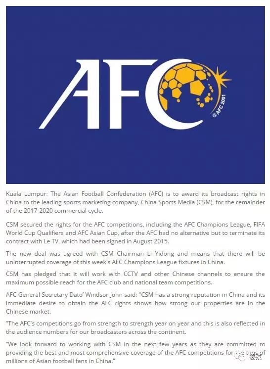 亚足联并未解释和乐视体育解约的缘由,不过据路透社报道称,原因是其未能支付最近到期的一笔分期付款。