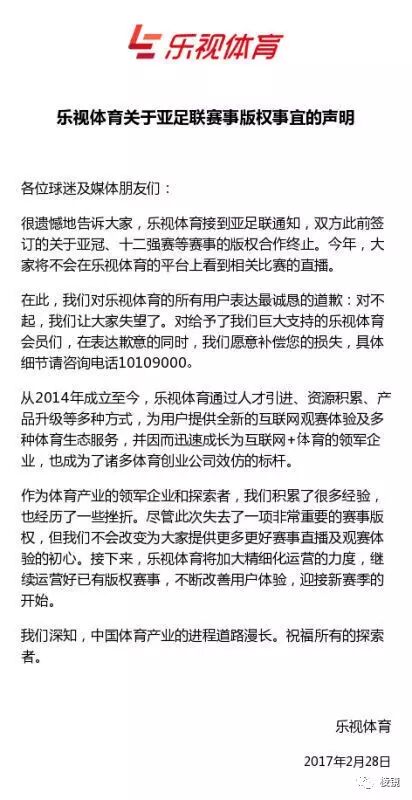 乐视体育随后在声明中称,“接亚足联通知,双方此前签订的关于亚冠、十二强等赛事的版权合作终止。今年,大家将不会在乐视体育的平台上看到相关比赛的直播。”