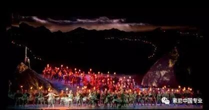 夜晚在山间行军的战士们举起了火把,一排一排的层次分明;一系列近景、特写、全景交替出现;分出层次的同时,舞台上火把的光影也递减得很厉害,前几排尚清楚,逐渐的到后面进入大山中的火把,已经无法看清,高清转播车的现场切换导演已经要求远处火把增加亮度;而此时4K拍摄却“我自岿然不动”。