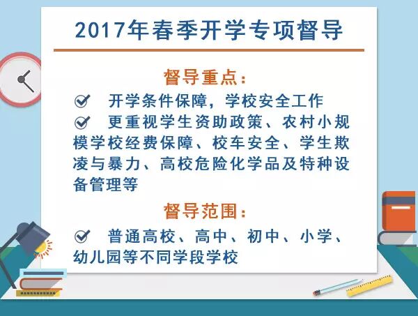 此次开学检查更关注一线学校,要求各督导组要深入基层,特别是基础薄弱学校、寄宿制学校、农村偏远学校、农民工子弟学校等,了解真实情况,发现薄弱环节,解决实际问题。,不干扰学校正常教育教学秩序,不给学校增加负担。