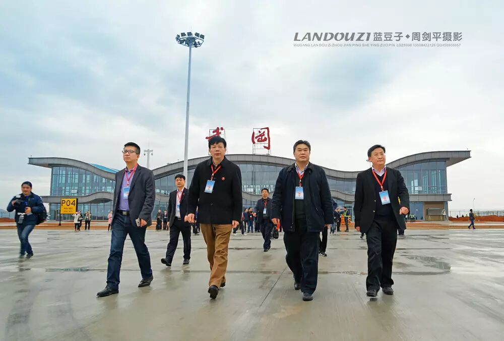 前往迎接的领导,从左至右分别为:民航中南地区管理局航务处处长江涛,湖南省机场集团副总经理刘国林,邵阳市武冈机场建设协调指挥部指挥长王长忠,武冈市委副书记、邵阳市武冈机场建设协调指挥部副指挥长刘贻银。