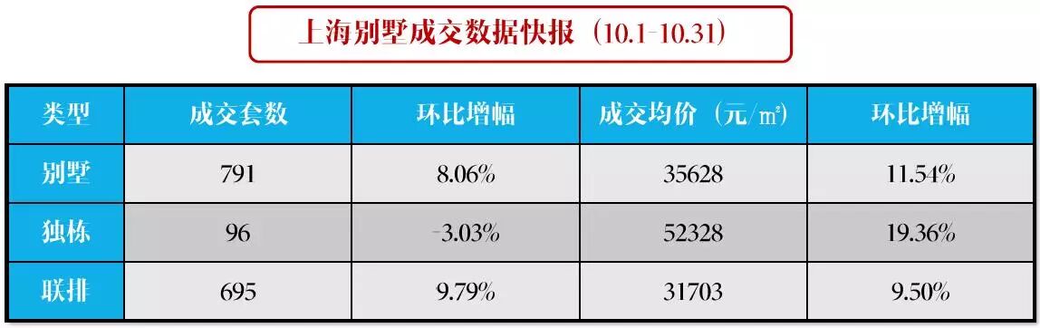 上月(10.1-10.31),上海别墅成交791套,环比增幅8.06%,成交均价35628元/㎡,环比增幅11.54%。