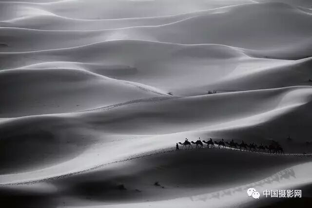 当人走在沙漠中,或者驼队走在沙漠中,他们都会成为沙漠风光的一部分,尤其是当他们在画面中占有很小的位置时,这些行进的驼队和人,会完美地融入到广阔的沙漠之中。