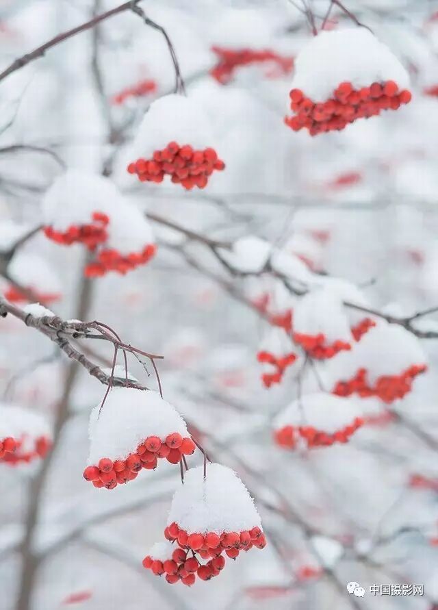 拍摄落在沙棘树枝上的积雪照片,利用彩色的果实作为主体,可以带来很强的视觉冲击力