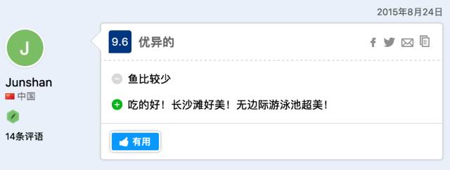 穷游er jonges415:蜜月去的,住了沙滩屋和水上屋。感觉非常好。有私人沙滩水下屋下面可以浮潜。 餐饮业很配口味。拖尾沙滩很迷人。