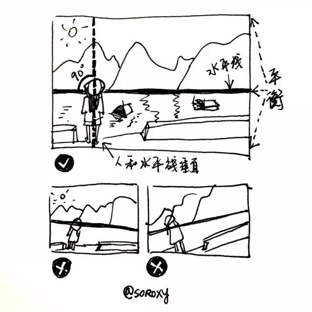 拍照的一个大大大忌就是照片东倒西歪的,每张照片都应该尽可能与水平线平衡。如果你要突出你的艺术才华,请将精力花在完美构图上。