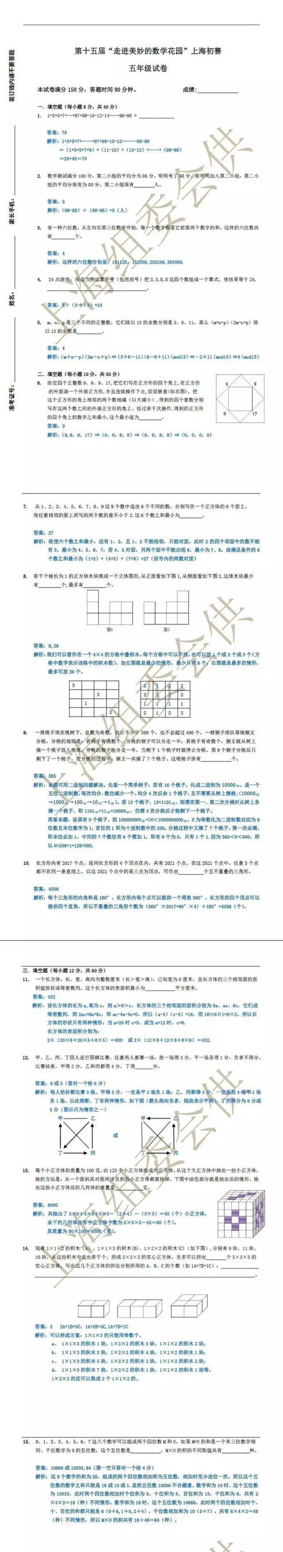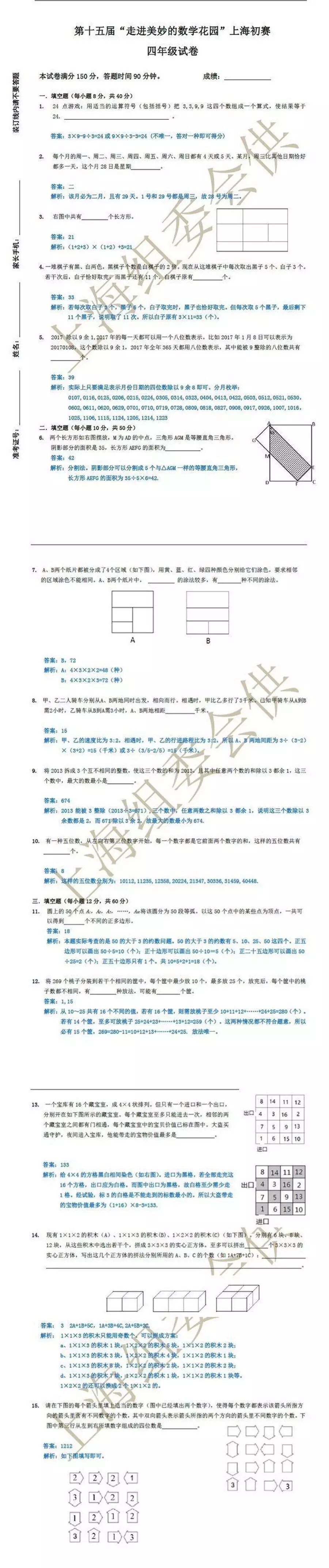 各年级试卷均包含15道试题,试题形式均为填空题,满分为150分各年级试卷均包含15道试题,试题形式均为填空题,满分为150分