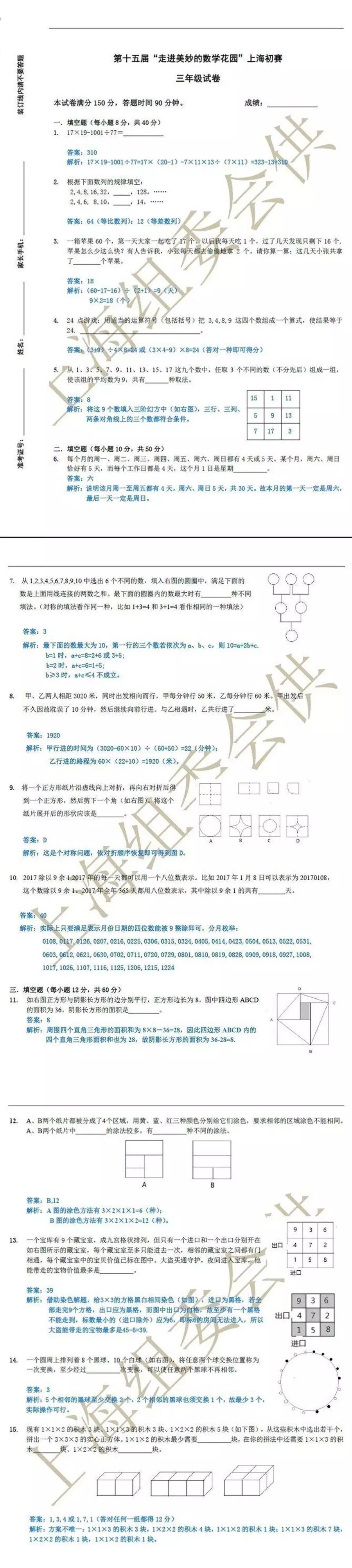 比赛名称:第十五届“走进美妙的数学花园” 上海初赛