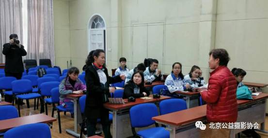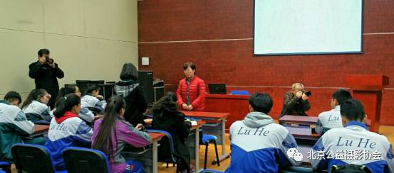由北京公益摄影协会创作部长李耀伟、学生部长王二平、监事会副主席赵树生、教学部长王燕君等四位老师,对潞河中学少数民族学生进行摄影构图技术技巧的指导。王燕君老师用大量鲜活的图片案例,精彩讲解了有关构图的基础知识,一小时的课堂互动,师生交流, 同学们认真的听着,有些同学目不转睛的看着老师,认真回答老师提出的问提,有些同学还做了笔记,下课之前同学们认真的记下了老师留的作业,学生们对摄影构图的学习有了新的收获与体会。理论课结束之后,老师们分别带着学生分小组进行实践活动,在校园里实操拍照,在几位老师指导下体会不同的构图方法与技巧。老师们的耐心指导吸引着同学们的学习热情,不断有学生在拍照中提出各种问题,老师们都是有问必答,解决了同学们对相机使用以及拍摄中的技术问题。