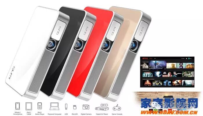 外观颜色:四种颜色的Q3系列,每种都代表了不同的年轻态度,奔放的红色,高贵的金色,静谧的 黑色,典雅的白色都颇具艺术气息, 体现了QUMI系列微投在不同的场景都能随心使用。