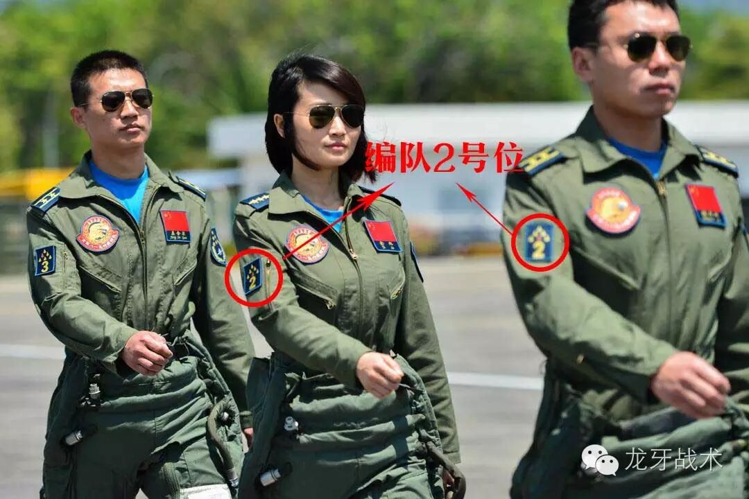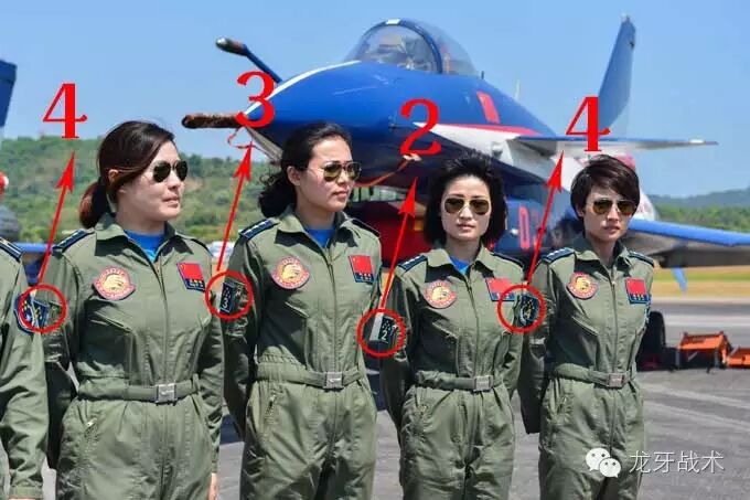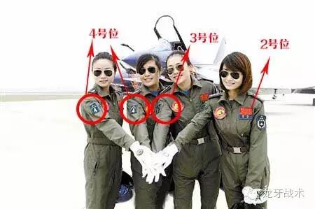 下面4位女飞行员的合影从臂章分析,两位同属编队第4位置(应该不是一架飞机,而是各配合另外一位更高军衔飞行水平更高的男性飞行员),余旭处于编队第2机位,另外一个女飞行员臂章显示处于编队第3机位,四位同期的女飞行员军衔都为上尉。