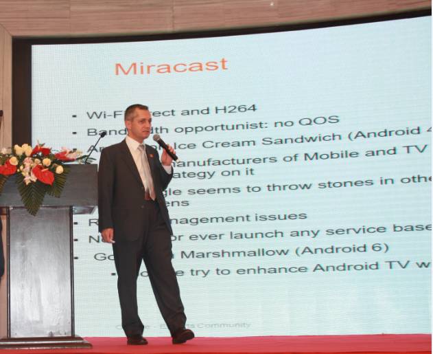 在移动端主导的领域中,很多广电运营商、OTT运营商采用技术标准去支持多屏互动。谷歌推出的Miracast技术,虽然不像多屏互动的技术,但其特点是采用wifi网络连接,以及H264协议,通过协议使手机上的视频镜像投放到电视屏幕上。但是至今没有任何运营商将Miracast作为主要技术,因为Miracast服务的用户体验不佳。比如你在用Miracast看电视同时下载歌曲,下载歌曲占用了大量带宽会导致视频卡顿或者停止播放。Martin Conan介绍到,谷歌在安卓4.0时代推出了并不成熟的Miracast,这个技术是谷歌破坏性的市场战略。最终,谷歌在安卓6.0时代彻底抛弃了Miracast。