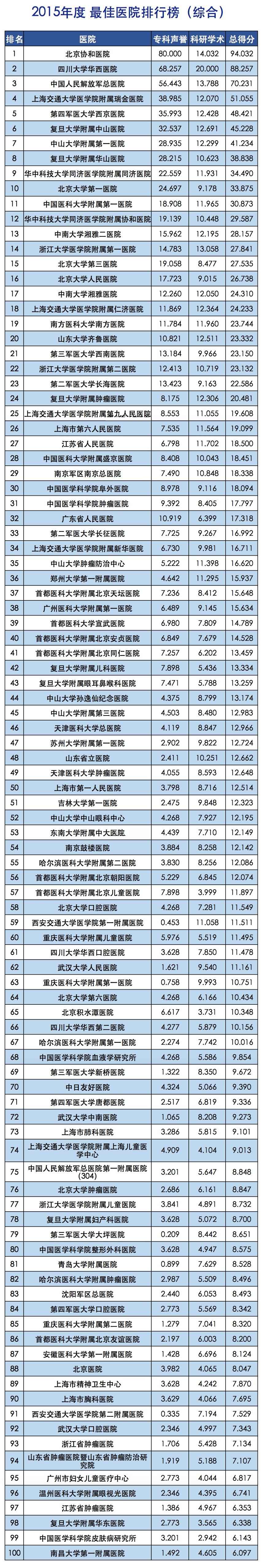 本报讯 (记者 孙国根) 由复旦大学医院管理研究所邀请全国37个临床专科的3969名国内著名同行专家担任评审的《2015年度中国最佳医院综合排行榜》和《2015年度中国医院最佳专科声誉排行榜》11月13日在上海发布,全国100家最佳医院和37个最佳专科名单揭晓,北京协和医院、。这是自2010年以来,复旦版中国最佳医院排行榜一年一度的第七次发布。