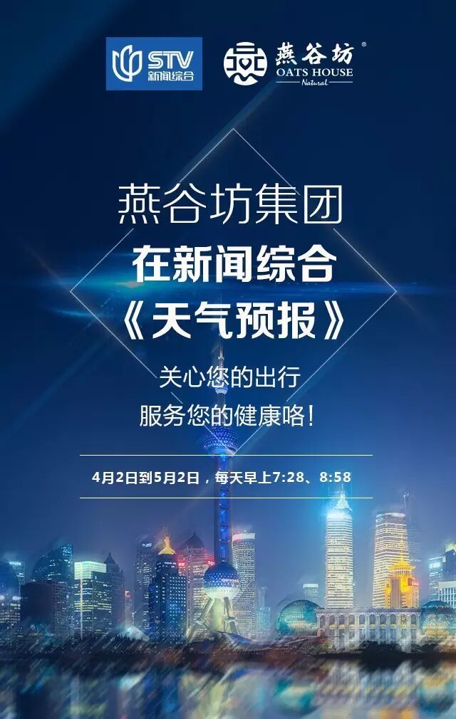 大家都知道,虽然只是在播报天气的方框框中出现5秒,但能上台面的都是像沈大成、森蜂园、杏花楼,这些口碑品牌。从4月2日早上7点28分起,燕谷坊集团也要加入这一团体了,非常荣幸地在早饭时段出现在家家户户的电视屏幕上。作为市民的温馨、贴心小棉袄,燕谷坊集团从吃,住、行,全方位关照您的生活,提供健康生态农品;提醒您开窗通风,还是关窗防雨;提示加衣减衣或是带好伞具。