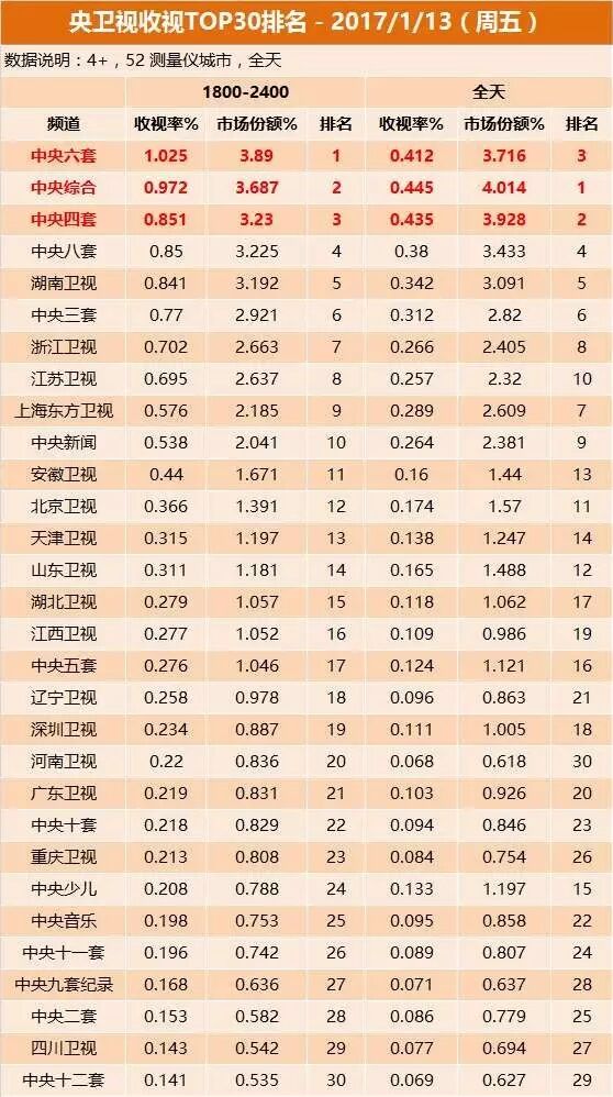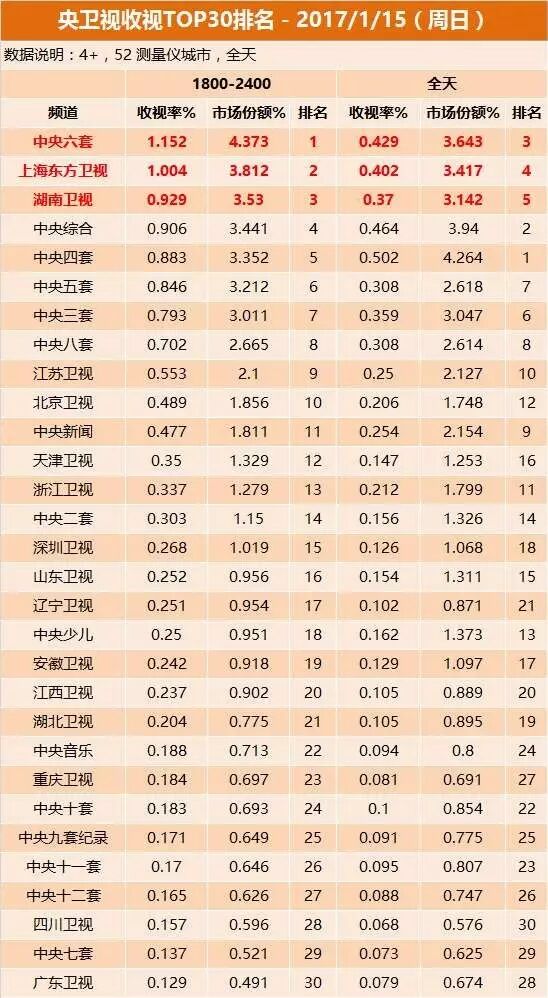 1月15日晚间,排名第一,上海东方卫视与湖南卫视分别排名第二、三位。