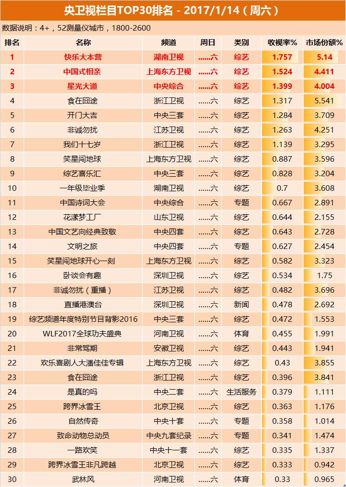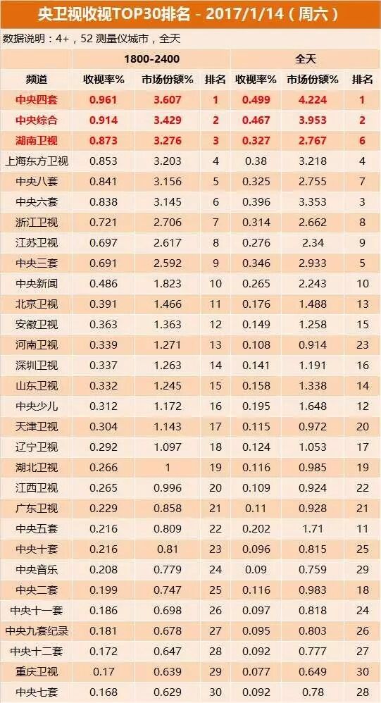 1月14日晚间,湖南卫视《快乐大本营》收视排名第一,、三位。