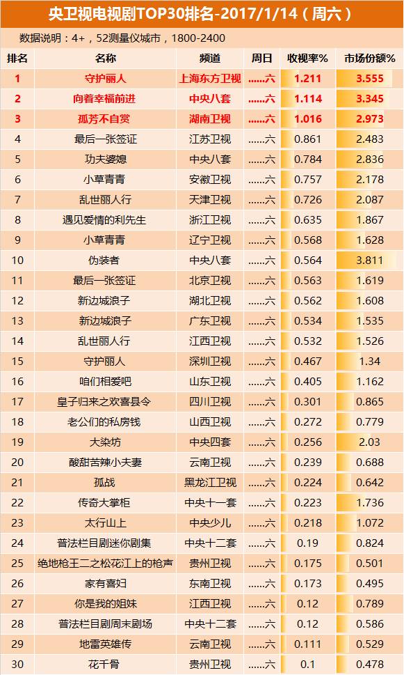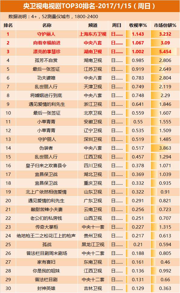 1月14日晚间,上海东方卫视《守护丽人》收视排名第一,、三位。