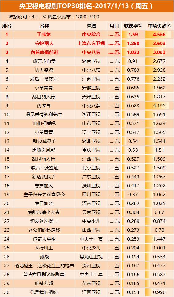 1月13日晚间,《于成龙》收视排名第一,、三位。