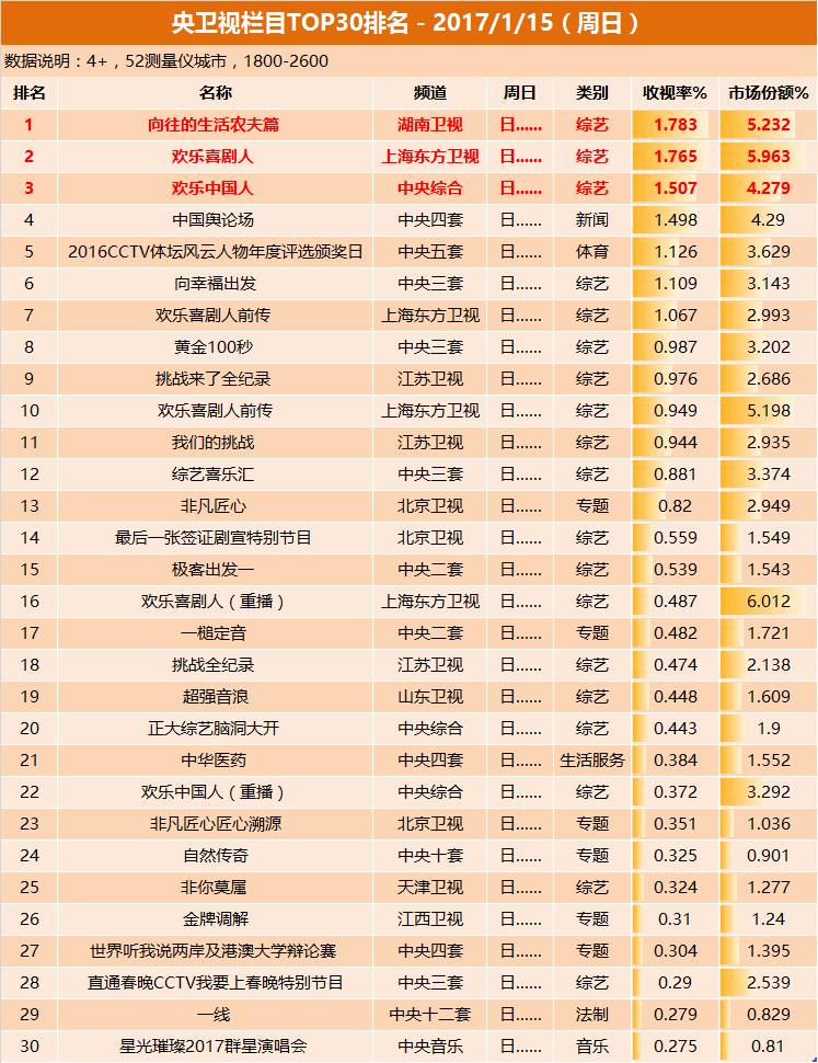 1月15日晚间,湖南卫视《向往的生活农夫篇》收视排名第一,、三位。