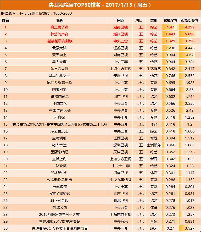 1月13日晚间,湖南卫视《真正男子汉》收视排名第一,、三位。