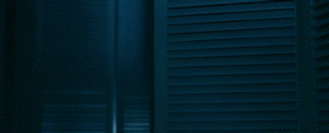 机位处于低角度,仰拍倚在门边上的男子,一开始,你透过玻璃门,看见凶手(影子)的快速移动。