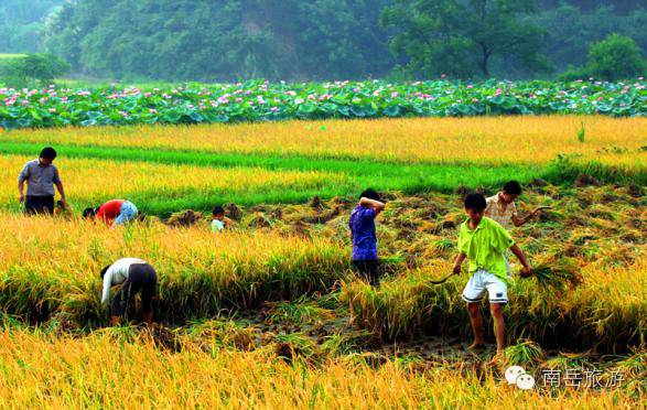 饱满的稻穗沉甸甸地低下了头,跟着风只轻微地摇摆,如金色的涟漪。割禾的农民早早地起来,在稻田里忙碌,感受着丰收带来的忙碌与幸福。