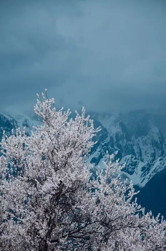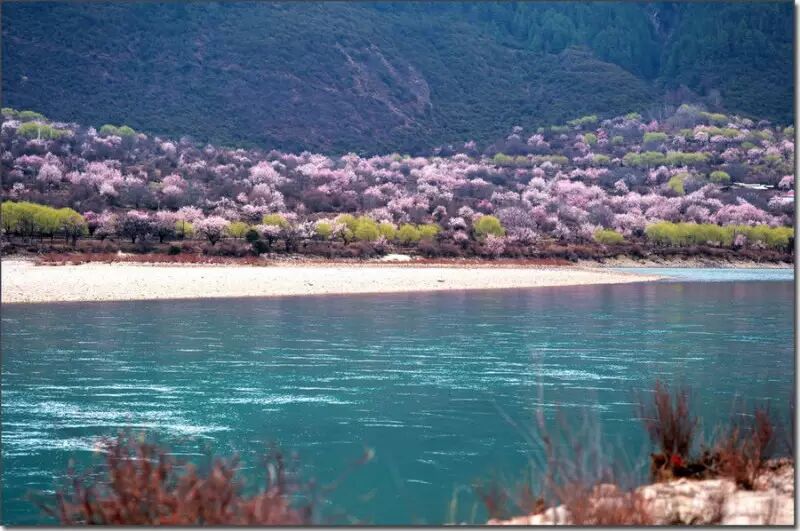 山顶白雪,山下桃花。江水清亮,沙洲横陈。每年三月中旬至四月初,漫山遍野的桃花开始铺满山坡,绵延至河谷,宛如缤纷的落霞映衬着湛蓝的云天和磅薄的雪峰之间,争奇斗艳,美不胜收。