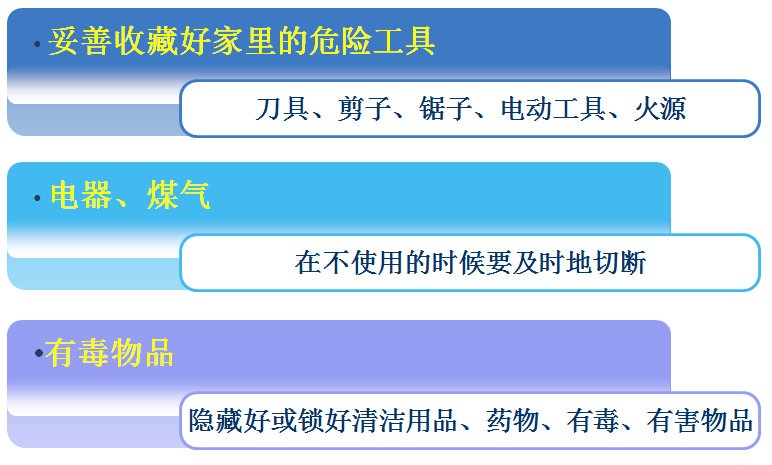 营造一个安全而人性化的居家环境,对于患者及看护者都是非常重要的。居家环境中要减少危险性物品,管理好患者使用的器具和物品,评估可能对其造成的危险程度,妥善安放以免发生意外。同时对于厨房安全、家用药品安全、防止意外及危险行为等方面也要采取一定的措施防患于未然。