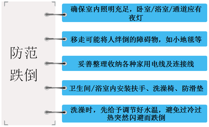 除此之外,还应注意其他安全措施的布置,如:在房门的顶部或底部安装安全门栓,防止老人不安全的游荡行为;安装烟雾报警器,并配备一个便于使用的灭火器;每部电话机上设置应急电话号码,家庭照护者的床边要留有电话和手电等。