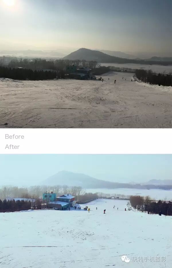 这一张照片依然尝试了类似的修图方法,结果依然看起来很杂乱,雪地里的杂草功不可没。