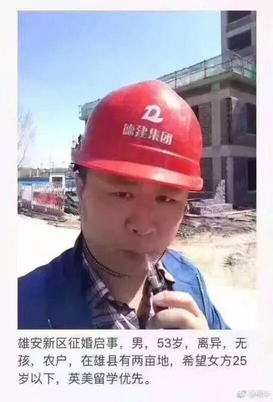 4月1日,中共中央、,,并将雄安新区与深圳经济特区和上海浦东新区归于同一重量级。消息甫一发布,雄安一名53岁离异中年人的征婚广告便在微信朋友圈当中风传,过后,又出现了67岁大爷和89岁老太的征婚广告。