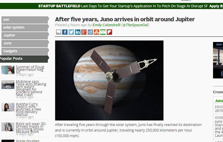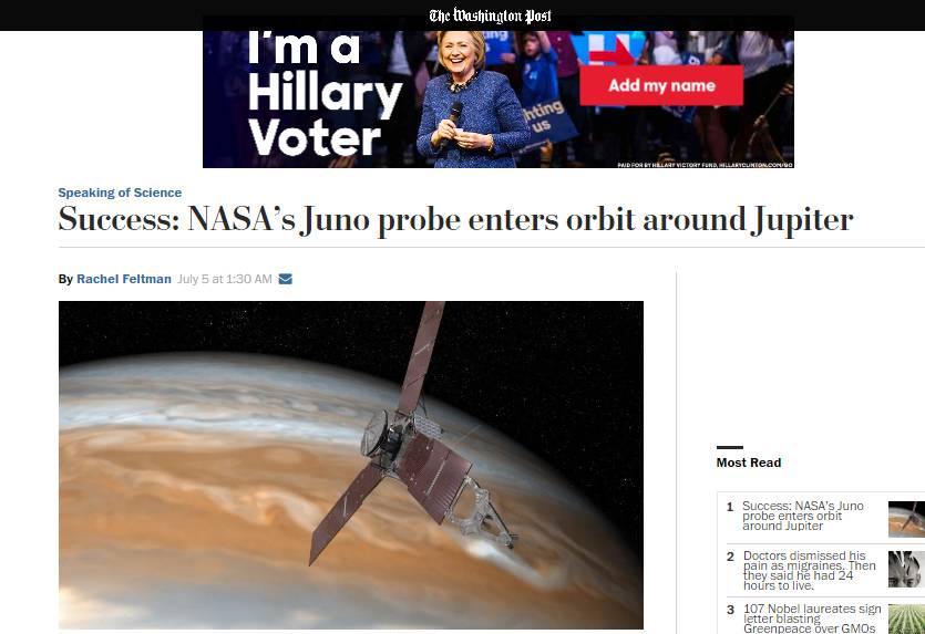 NASA的高冷动作一向牵动着媒体的心,当2011年向木星发射Juno探测器以来,各家媒体就表现出浓厚的兴趣,这五年,也给世人留下了一个巨大的悬念:朱诺能否准时赴约"朱庇特”(Jupiter)?所以当NASA官方宣布这一好消息后,包括科技媒体TechCrunch、主流媒体CNN、新媒体资讯Buzzfeed、赫芬顿邮报在内的各大媒体都把这一消息高悬首页,。