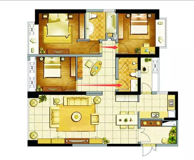 卫生间的潮湿和异味是整个户型中最严重的,如果卫生间正对卧室时,这种不利于人体的异味和潮湿只能通过卧室散发出去,就会影响业主的身体和心理健康。