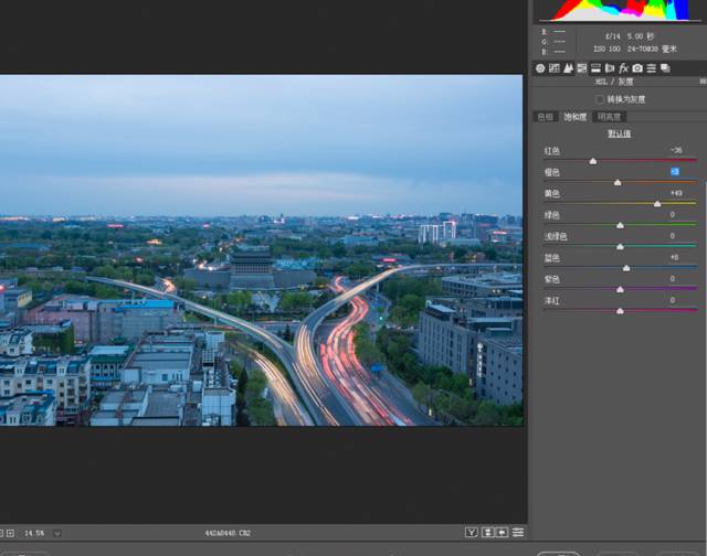 2、 进入HSL调整会发现汽车尾灯的红色已经非常鲜艳,这里我会单独在饱和度菜单调整红色,降低红色的色值,为了让道路灯光和汽车灯光更加鲜艳我会增加黄色49,以及对天空的蓝色进行增加8,其实Camera RAW强大就强大在针对单独色彩进行微调,这里设计师可以控制每一个颜色的明暗