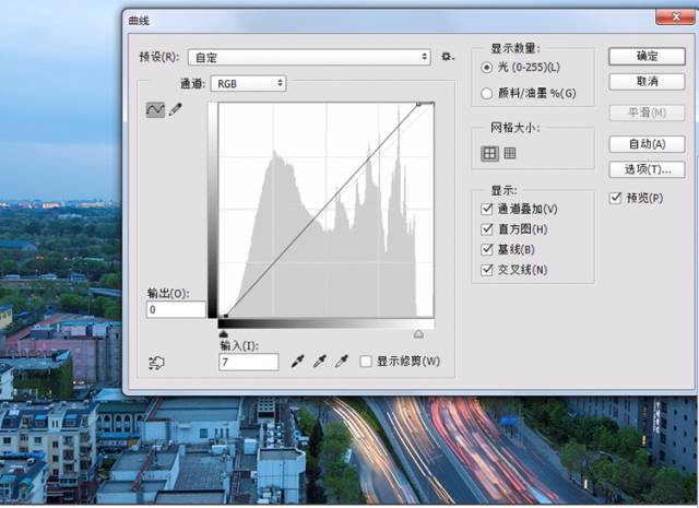 3、针对画面的不足需要调整曲线,将按CTRL+M呼出曲线将直方图二侧的空白调整到明显直方图灰色位置确保直方图中无空白区域增加画面的明暗对比