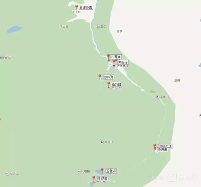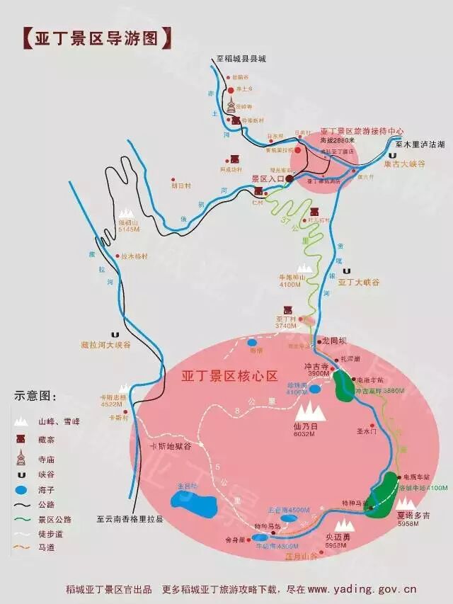 1.亚丁风景区:冲古寺、洛绒牛场、牛奶海、五色海、珍珠海、杜鹃坪