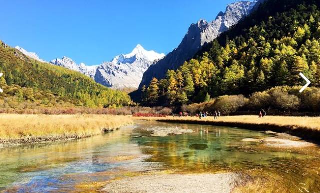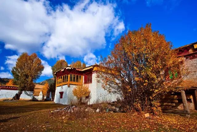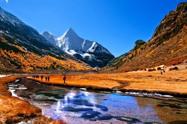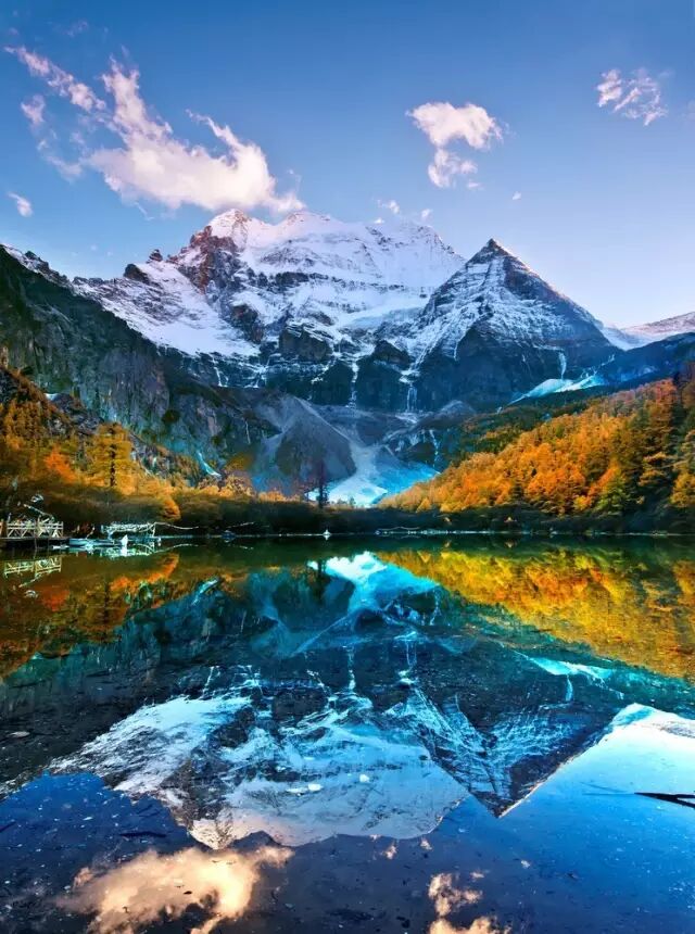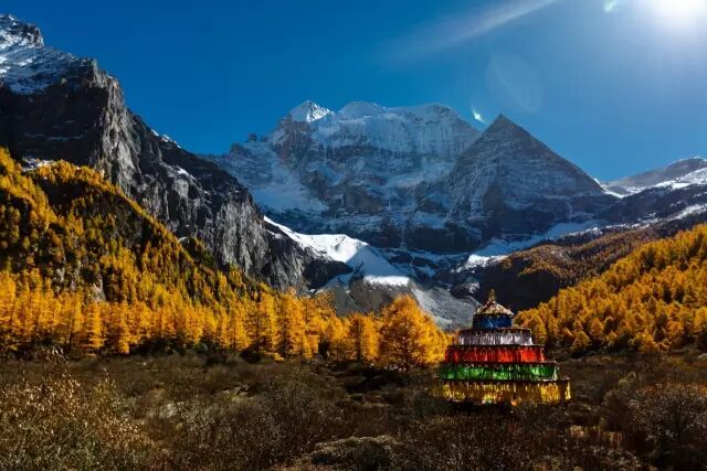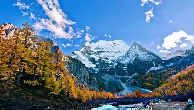 秋季(9-10月)稻城红黄相间,红草地与万亩金色杨树林让稻城五彩斑斓,雪山在蓝天白云的衬托下,更显梦幻。