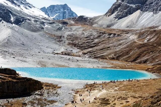 牛奶海在央迈勇的山坳里,呈扇贝形,中间是碧蓝的雪水,周边则是一圈乳白色环绕,这圈乳白色大致就是牛奶海名称的由来。从洛绒牛场徒步3小时到达,也可骑马(骑马上山往返费用300元,马匹数量有限,需要提前预定)前往。