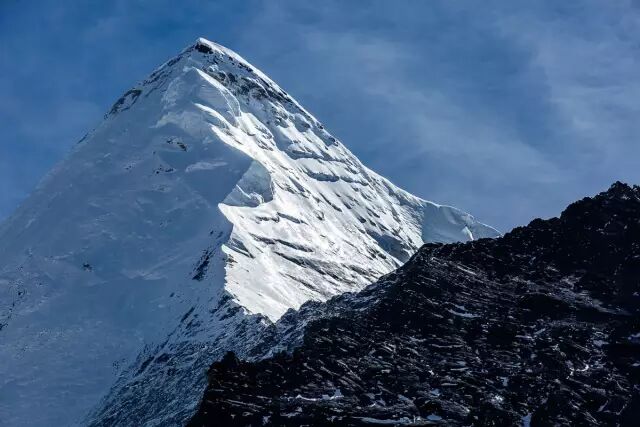 夏诺多吉意为“金刚手菩萨”,是“三怙主”雪山的东峰,海拔5958米,在“三怙主雪山”佛位第3。雪山的主峰为三棱锥状,在3座雪山中造型最接近金字塔,沿雪山两翼锋利的刃脊蜿蜒绵亘,刃脊背向光线的一侧呈暗影,蓝天中勾勒出的线条尖锐有型。