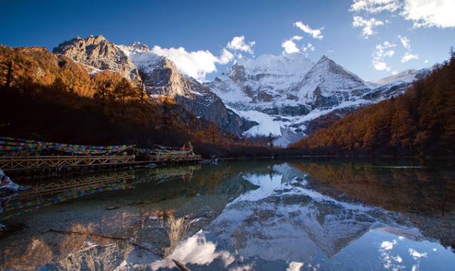 第一天进景区,从冲古草甸徒步经过冲古寺到珍珠海,拍摄仙乃日在珍珠海中的倒影;返回到冲古寺如果还有时间,可以乘坐电瓶车到洛绒牛场拍摄央迈勇(此时光线并不理想,不要期望太高),并徒步走栈道6.8公里回冲古草甸(体力差的就电瓶车往返),在冲古草甸拍摄夏诺多吉的日落金山,回亚丁村住宿。
