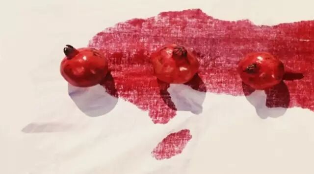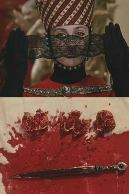 影片中,帕拉杰诺夫全然摒弃了运动镜头,而谨以固定机位注视着一个个或动或静的瞬间。作为导演,他对于石榴与水果刀的注视有如静物写生。这一刻,石榴在白色布匹上晕染开鲜血般素艳的红色。继而是一把古旧的匕首,同样在白色布匹上晕染开鲜血般的红色。