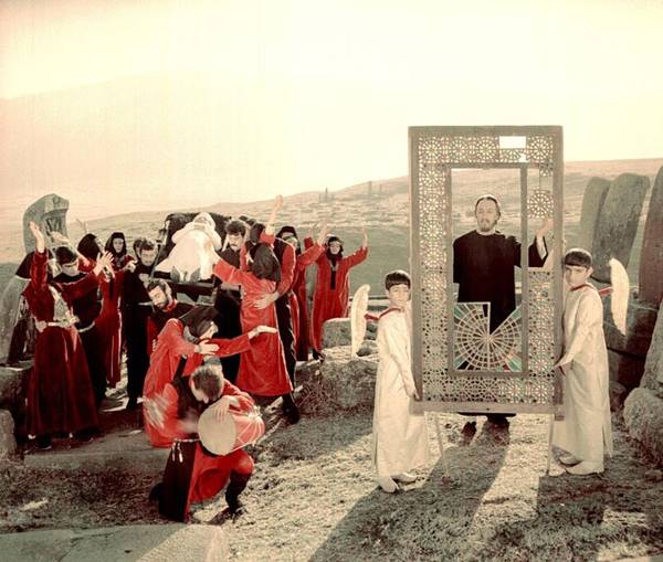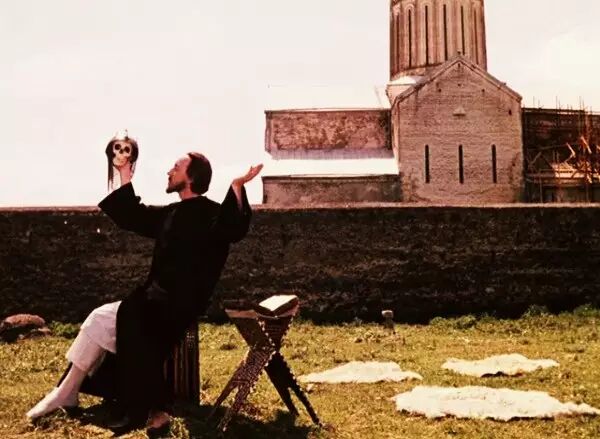 在表现亚美尼亚独有的祭祀、洗礼等仪式时,影像的构图则以平面式的局部全景,呈现出一种非常奇妙的舞台感。与其他导演不同的是,帕拉杰诺夫的舞台既没有棱角,也没有翻转,而更像是流浪艺人所建构的最原始的小舞台,一切生离死别都展现于固定的取景框中。在这个舞台上,演员只能水平进退,而不能上下坡,他们的举手投足只属于地平线。