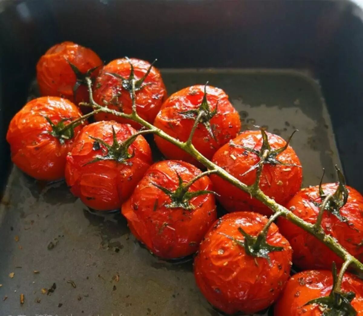 对半切开,撒上海盐、奶酪碎、罗勒叶。