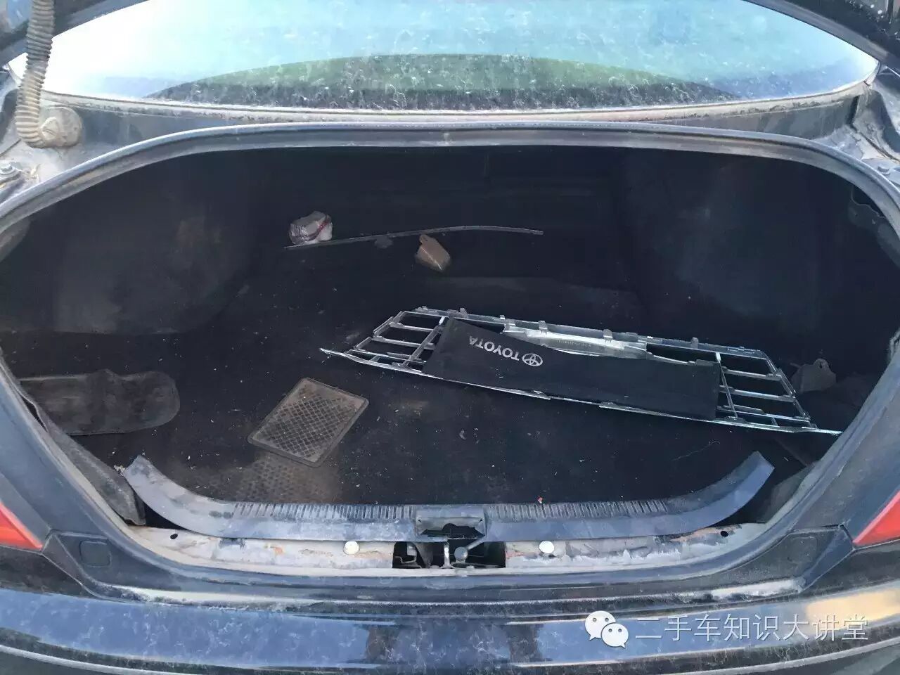 备胎坑的胶杂乱无序,粗略一看大家肯定都会怀疑这必然不是原厂胶,这货后备箱肯定切割过。但我看过很多老锐志的后备箱胶,其实原厂胶就很混乱。并且最关键的一点是,如果后备箱有过切割,那么后备箱开口那儿不可能还用旧的钢板。
