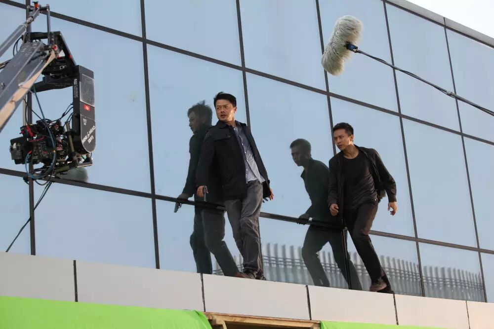 电影中追逐场景的大楼是在天台上新搭出来的一个楼顶上进行的。美工用和商务中心一模一样的玻璃,搭了一个三层的20米见方——对称的,玻璃结构。两面都是长十几米、高四五米的大玻璃,中间有一个桥梁连接的地方,就是主要的表演范围。