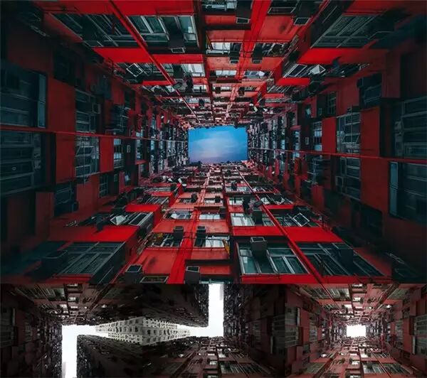 这其实是同一幅照片,转成两个不同方向后,再合成并加上天空的超现实影像。